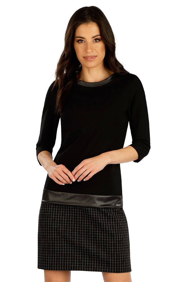 Šaty dámske s 3/4 rukávmi. Vrchná časť je vyrobená zo silnejšieho elastického úpletu, ktorý dokonale drží tvar a pohodlne sa nosí. Sukňa vo vzore jemnej kocky na čiernej farbe. Spojovací pás a lemovanie je vyrobené z materiálu imitujúceho popraskanú kožu. Dĺžka šiat je približne 90 cm.